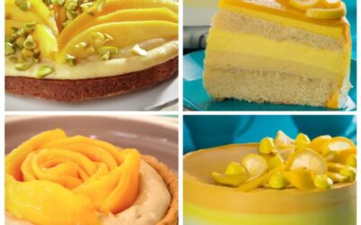 Mango-Citroentaart Zu sehen sind ein tropischer Kuchen mit einem Kuchen, wie aus einer Bank und einer Bäckerei, und ein Mangomousse…