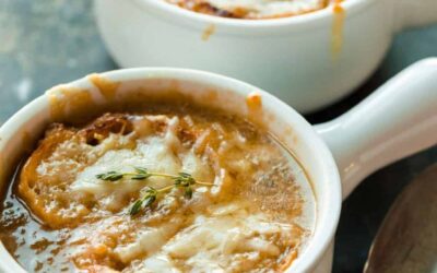 Ein Löffel karamellisierter französischer Zwiebelsuppe in einer kräftigen Brühe mit knusprigem Käsetoast ist etwas, wovon wir einfach nicht genug bekommen…