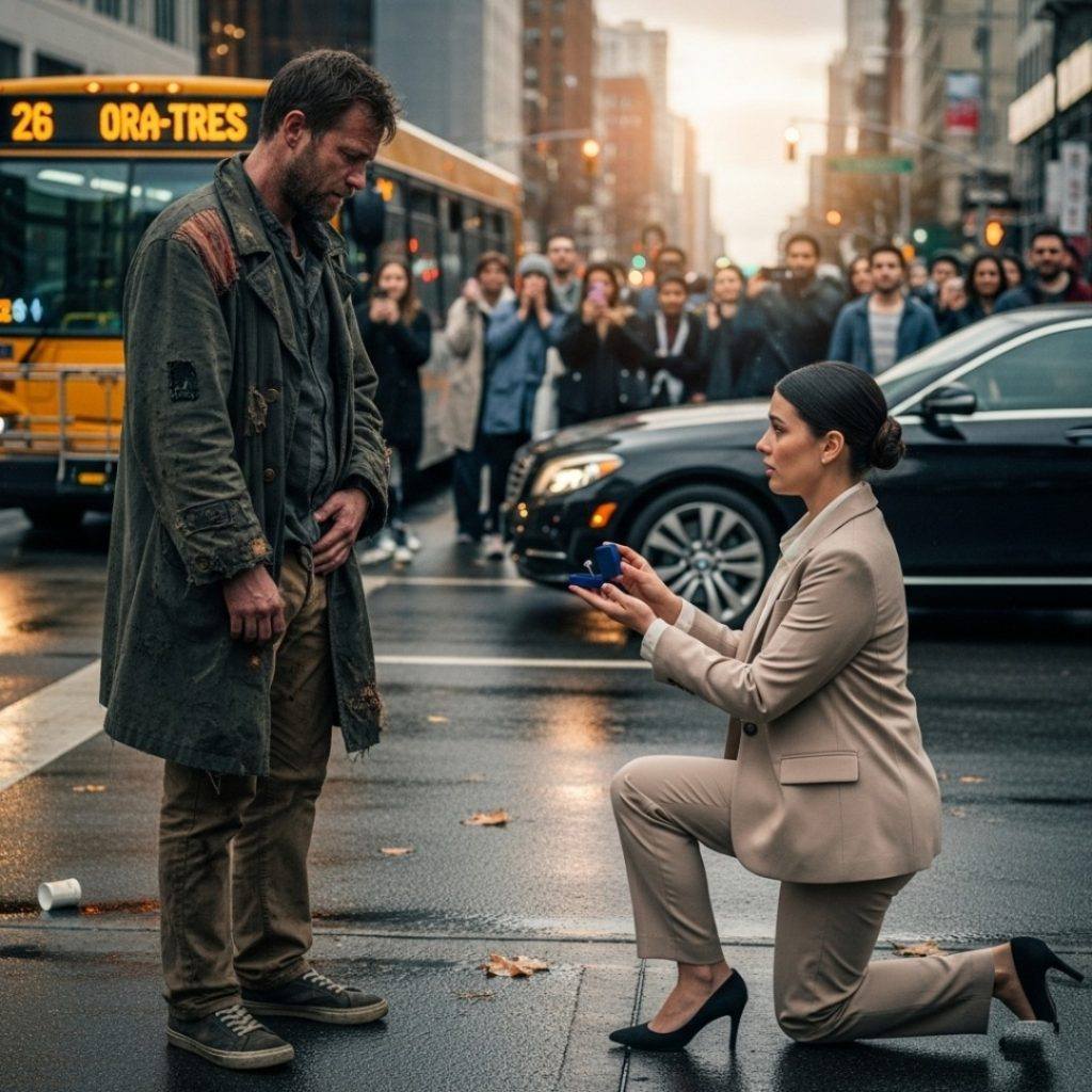 Ein leichter Regenschleier lag in der Luft, während die Menschen mit hochgezogenen Regenschirmen und gesenkten Augen vorbeieilten – doch niemand bemerkte die Frau im beigen Anzug, die mitten auf der Kreuzung auf die Knie fiel. Ihre Stimme zitterte. „Bitte … heirate mich“, flüsterte sie und umklammerte eine Samtschachtel.
