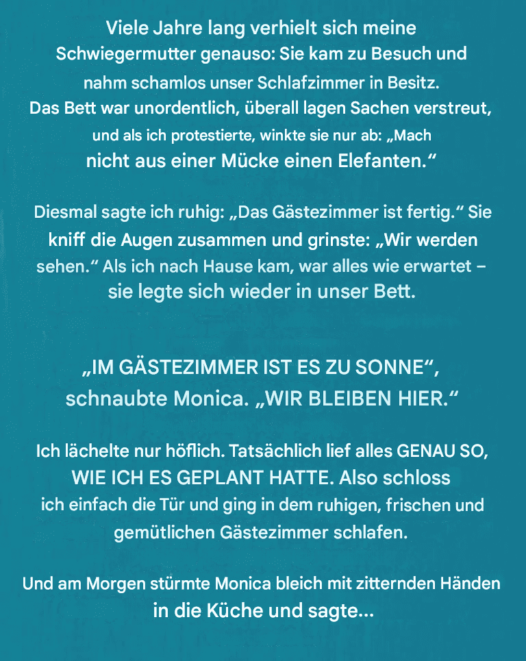 Phase 1. Der Morgen, als Monica kreidebleich in die Küche stürmte.