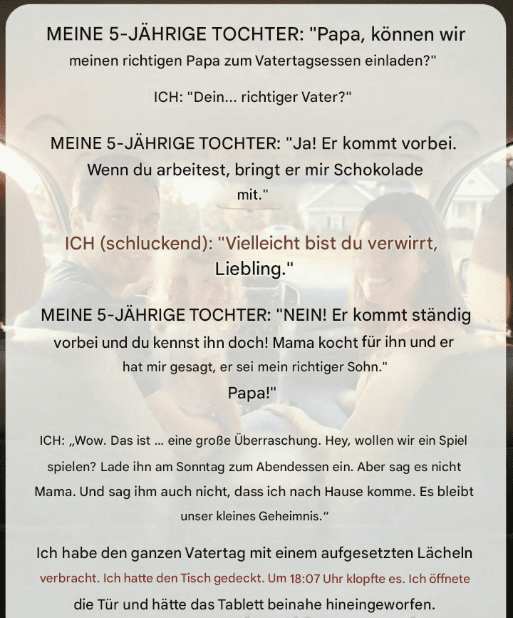 Nichts in Lilys Stimme klang dramatisch oder warnend. Sie stellte die Frage genauso, wie man nach zusätzlicher Hilfe im Haushalt oder etwas anderem fragen würde. Der Ausrutscher fiel wie ein selbstverständlicher Teil ihres Alltags in den Raum, etwas, das sie sich ausgedacht hatte, etwas, das ich bereits wusste. Genau das beunruhigte mich am meisten. Ihre Unschuld war ein Spiegel, ein Abbild des Abgrunds zwischen ihrer Welt und der, die wir zu teilen glaubten. Als sie das „Überraschungsessen zum Vatertag“ in die Tat umsetzte, spürte ich, wie sich etwas in mir veränderte, als würde es beben. Behutsam führte sie ihn, stellte vorsichtig eine Frage nach der anderen und versuchte, mein rasendes Herz nicht durchblicken zu lassen.