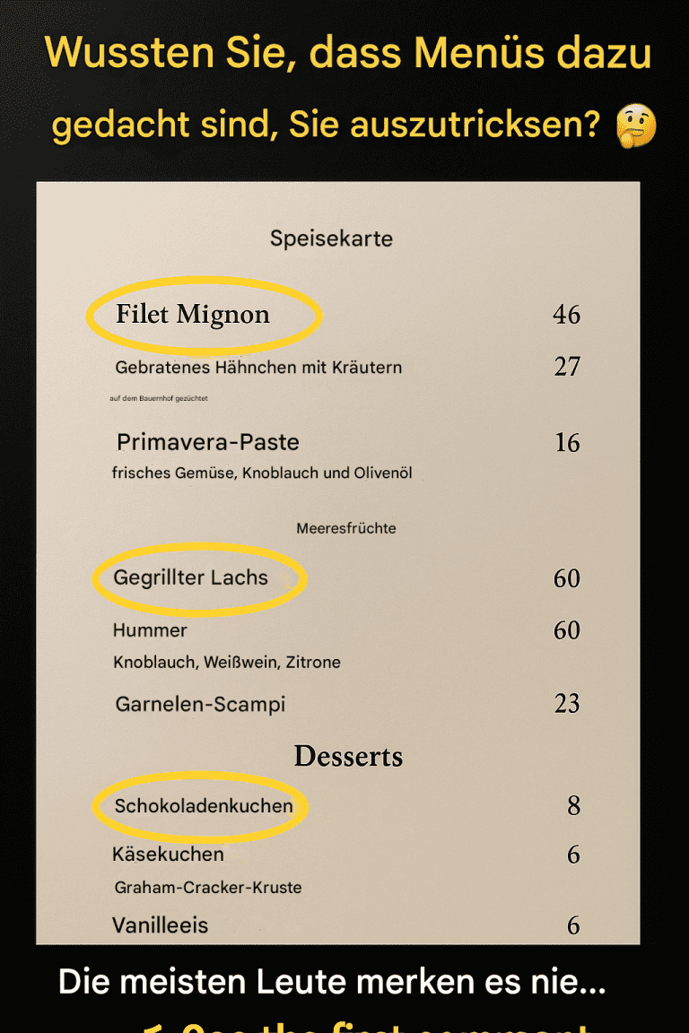 Wenn Sie sich in ein Restaurant setzen, denken Sie wahrscheinlich, Sie lesen nur eine Speisekarte. Doch Speisekarten sind in Wirklichkeit psychologische Hilfsmittel, die Ihre Auswahl – und Ihren Geldbeutel – beeinflussen sollen.