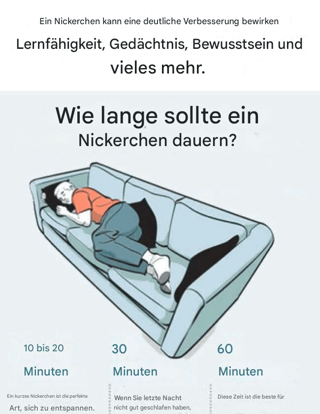 Schlafexperten erklären in dem Artikel, dass ein kurzes Nickerchen von 10 bis 20 Minuten die meisten Vorteile bietet. Je nach gewünschter Schlafdauer können jedoch auch andere Werte optimal sein. Für einen schnellen Energieschub und mehr Konzentration ist ein kurzes Nickerchen von 10 bis 20 Minuten laut Experten ausreichend, um schnell wieder arbeitsfähig zu sein.