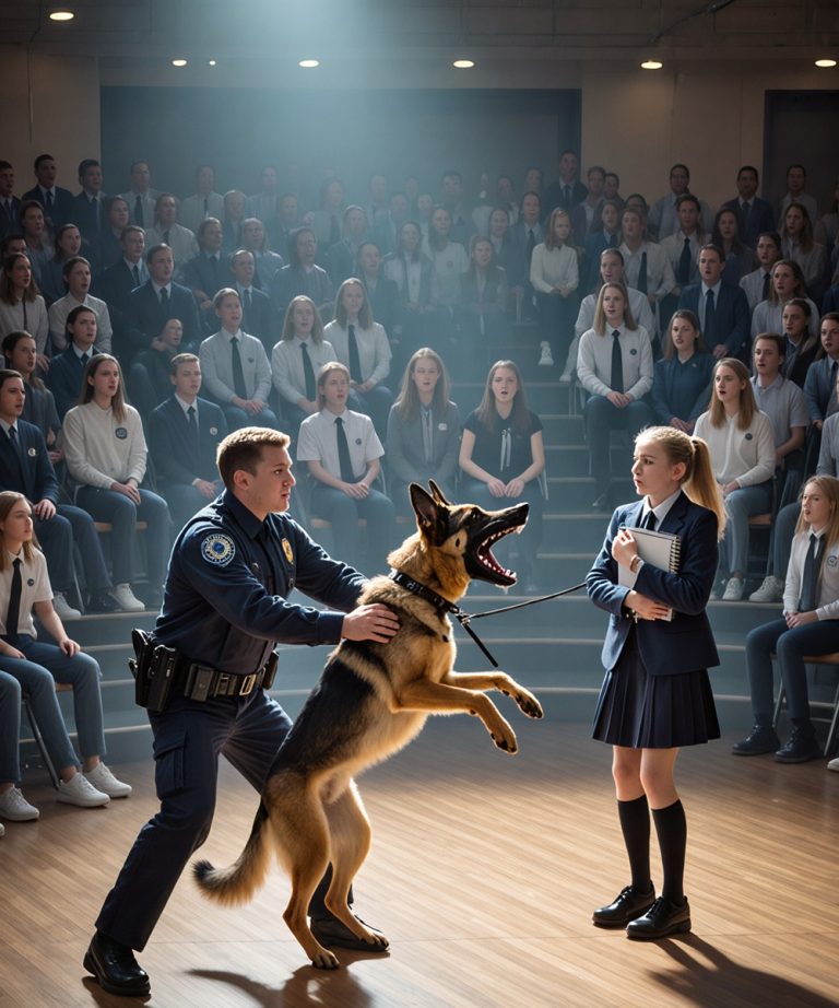 An der City High School Nr. 17 fand eine „offene Unterrichtsstunde“ zum Thema Sicherheit statt. Schüler, Lehrer und Eltern versammelten sich in der großen Aula und waren gespannt, was passieren würde. Ein Polizist in voller Uniform betrat die Bühne. Sein Partner – ein Deutscher Schäferhund namens Rex – ging ruhig an seiner Seite.