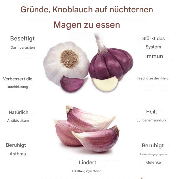 Knoblauch ist eines der ältesten und wirksamsten Naturheilmittel, das kulturübergreifend zur Stärkung des Immunsystems und zur Vorbeugung vieler Krankheiten eingesetzt wird. Wussten Sie jedoch, dass der Verzehr von Knoblauch auf nüchternen Magen seine Wirkung noch verstärkt? Der Verzehr zu dieser Tageszeit ermöglicht dem Körper eine effizientere Aufnahme, da der Magen leer und aufnahmefähiger für die Wirkstoffe ist.