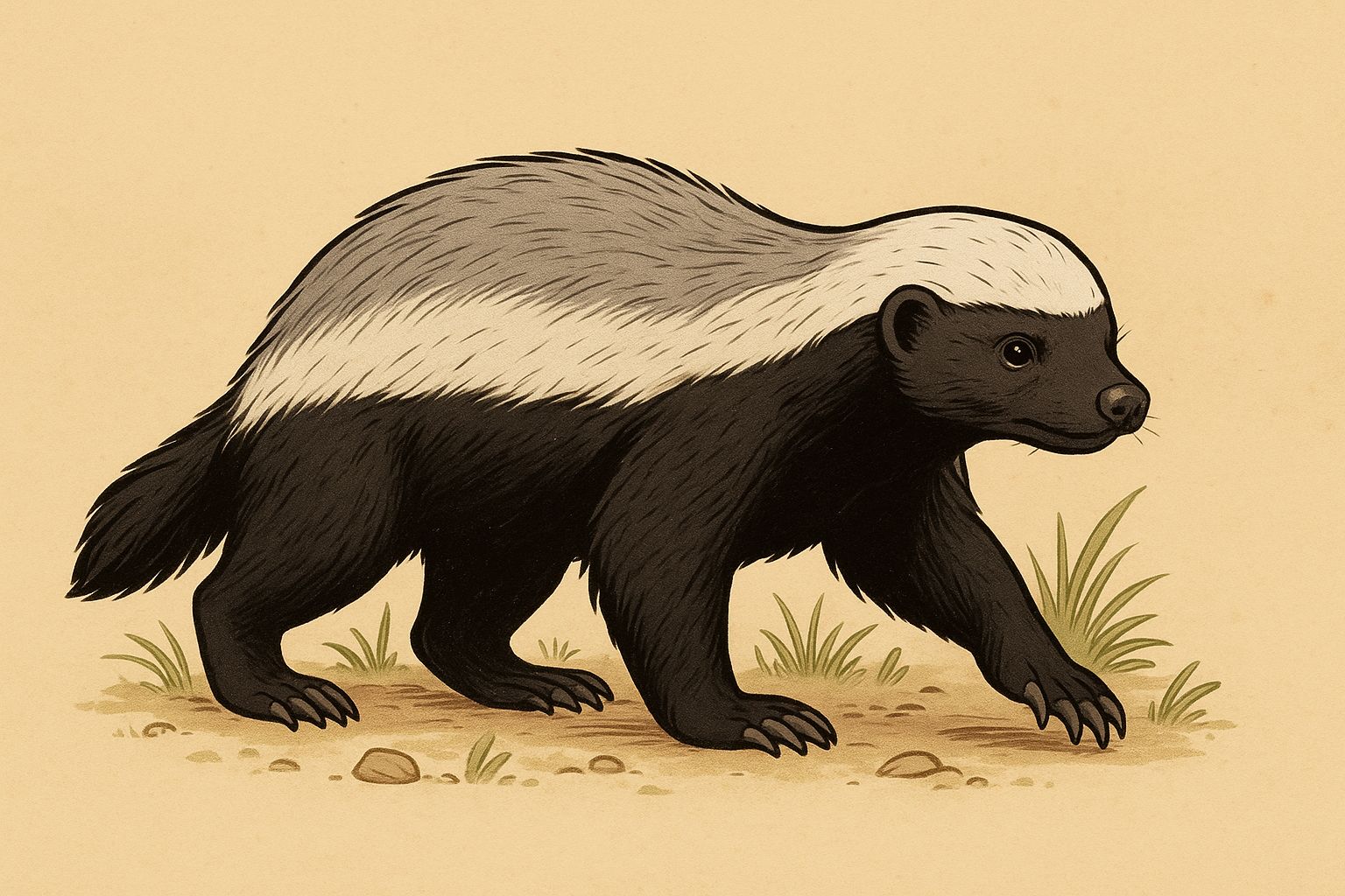 Der Honigdachs ist gedrungen gebaut, hat kurze, kräftige Beine und lange, scharfe Krallen, die er zum Graben und zur Verteidigung einsetzt.