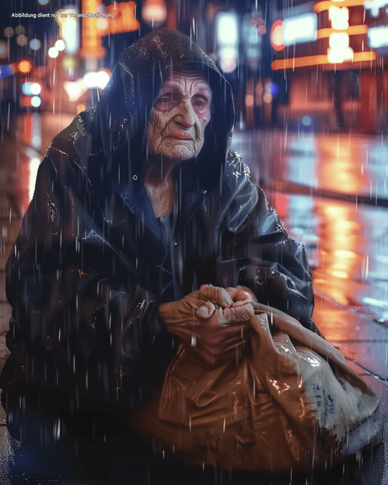 Sie saß zusammengesunken auf dem Bordstein unter einer erlöschenden Straßenlaterne, durchnässt und regungslos. Sie war älter, vielleicht Ende fünfzig oder sechzig, aber irgendetwas an ihr wirkte seltsam.