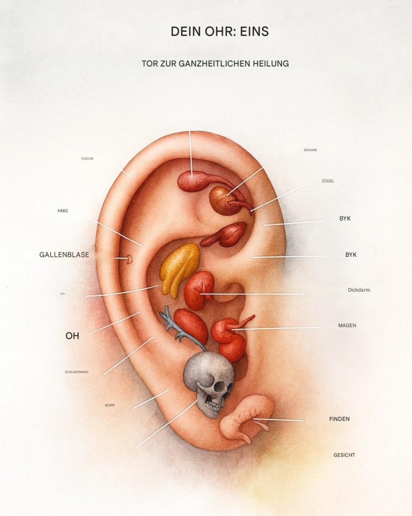 Unser Körper ist faszinierend, weil er so eng miteinander verbunden ist. Wussten Sie, dass die Ohren wie eine Landkarte des gesamten Körpers funktionieren? In der Traditionellen Chinesischen Medizin (TCM) und der Aurikulotherapie (Ohrakupressur) wird das Ohr als Mikrosystem betrachtet, das verschiedene Organe und Körperbereiche widerspiegelt.