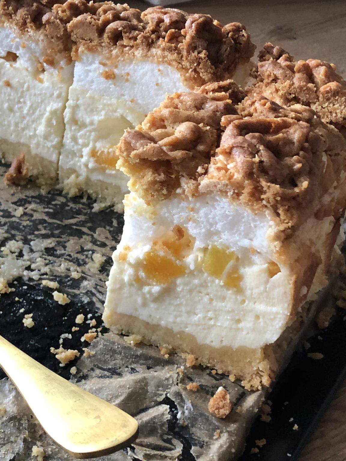 Dies ist eines meiner liebsten Käsekuchenrezepte! Ein knuspriger Boden, eine saftige Käsekuchenfüllung mit Pfirsichen, eine fluffige Mousse und das Ganze mit Streuseln garniert.