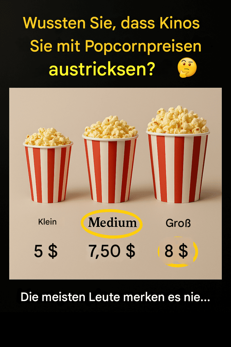 Wer schon einmal im Kino war, kennt das: Man geht zum Kiosk und hat Lust auf Popcorn, wirft einen Blick auf die Preise und überlegt plötzlich, ob man eine kleine, mittlere oder große Portion nehmen soll. Auf den ersten Blick sieht die mittlere Portion vernünftig aus – bis einem etwas Merkwürdiges auffällt.