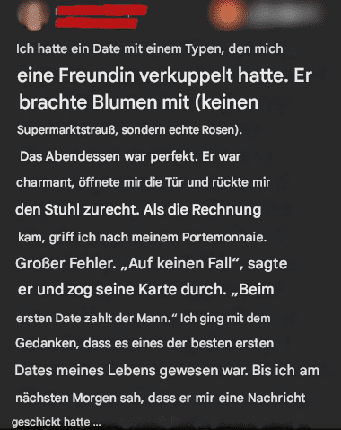 Als Eric für unser erstes Date Geld verlangte, dachte ich, ich hätte einen echten Aristokraten kennengelernt. Rosen, ein nettes Geschenk, interessante Gespräche – er prüfte alles genau. Als er mir am nächsten Tag schrieb, erwartete ich eine nette Nachricht, doch als ich sie las, sank mir das Herz in die Hose.