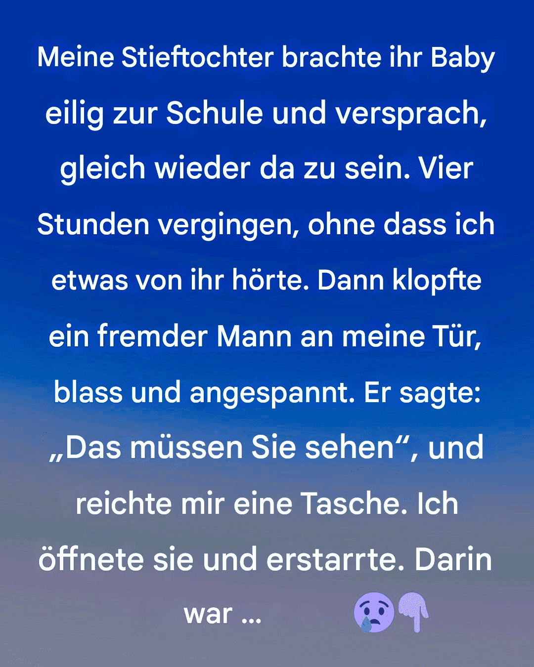Atemlos. Blass. Ihr Haar war zu einem wirren Knoten verknotet, als hätte sie tagelang nicht geschlafen. Meine Stieftochter stand im Türrahmen, die Wickeltasche fest umklammert, ihr Blick wanderte überall hin, nur nicht zu mir.