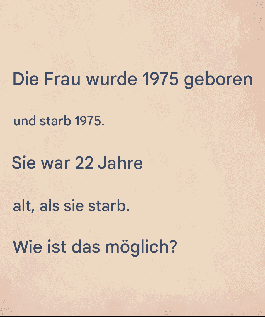 Rätsel: Diese Frau Stellen Sie sich vor: Beim Scrollen durch die Nachrichten stoßen Sie auf diesen seltsamen Satz. „Die Frau wurde 1975 geboren und starb 1975. Sie war 22 Jahre alt.“ Er lässt Sie erstarren. Unverständlich? Verstörend? Natürlich gibt es irgendwo einen Haken … Aber wo? Halten Sie sich fest, denn dieses Rätsel stellt unsere Logik, unsere Reflexe und ein wenig Vorstellungskraft auf die Probe. Was, wenn der Schlüssel gerade darin liegt, nicht auf die übliche Weise zu denken?