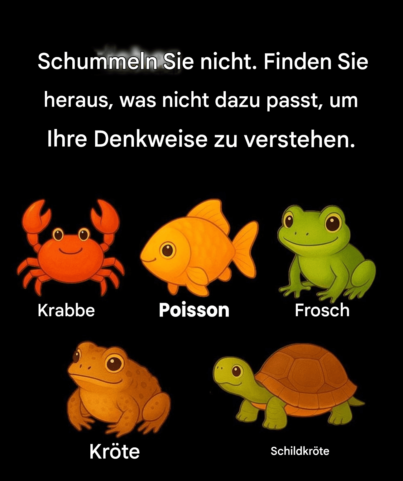 Diese kleinen visuellen Herausforderungen, die in den sozialen Medien kursieren, sind Ihnen bestimmt schon begegnet: fünf niedliche Tiere, eines, das nicht dazu passt … und am Ende eine überraschende Enthüllung. Hinter ihrem verspielten Äußeren verbirgt sich unsere Neugier: Warum wählen wir spontan das eine Tier dem anderen vor? Was steckt hinter diesem unmittelbaren Reflex? Und was wäre, wenn Ihr erster Impuls mehr über Ihre Wahrnehmung der Welt verraten würde, als Sie denken? Bevor wir die Interpretationen entdecken, stellen Sie sich diese fünf Tiere kurz vor: eine Krabbe, einen Fisch, einen Frosch, eine Kröte und eine Schildkröte. Welches erscheint Ihnen spontan „anders“? Merken Sie sich Ihre Wahl … los geht’s!